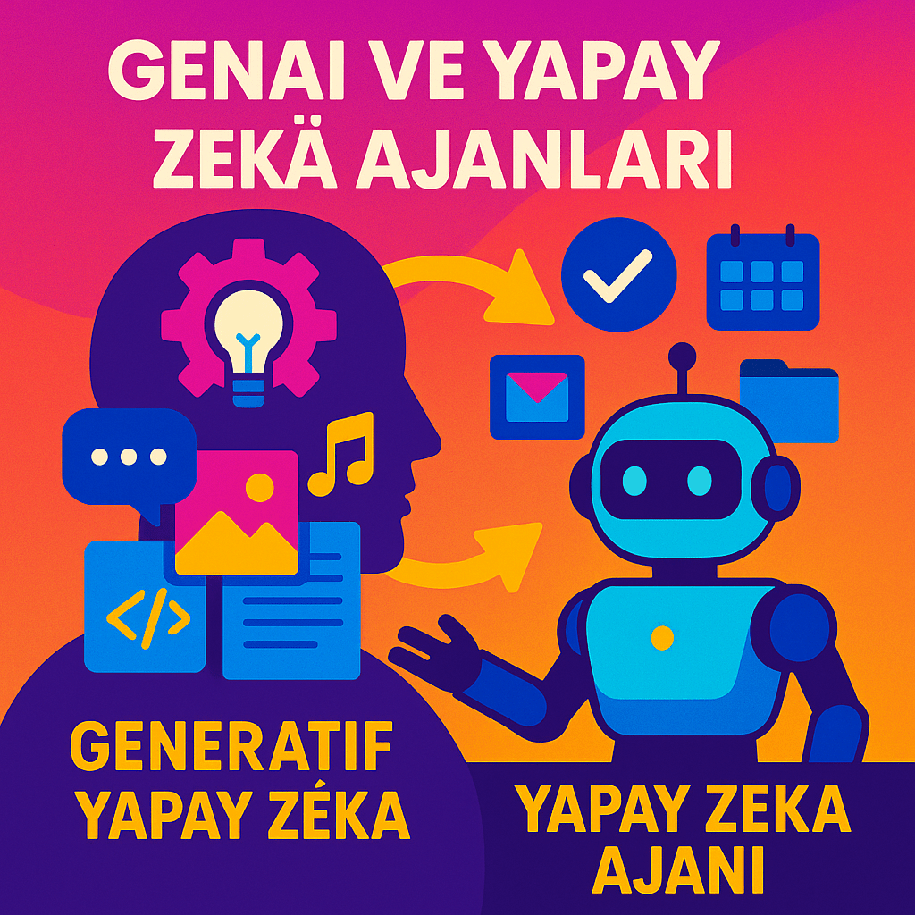GenAI, ChatGPT ve DALL·E gibi modellerle metin, görsel, müzik üretirken; AI ajanları AutoGPT, Google Duet AI Agent gibi sistemlerde çok adımlı görevleri sizin yerinize planlayıp icra eder.
